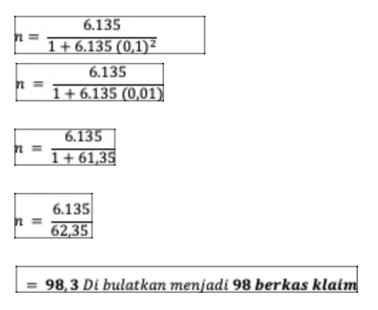 Dari hasil diatas, maka penulis mengambil sampel sejumlah 98 berkas klaim rawat inap untuk menghitung pengaruh kelengkapan pengisian resume medis terhadap pengajuan klaim BPJS Kesehatan di Rumah Sakit Mata Cicendo Bandung.. Penulis mengambil sampel dari banyaknya populasi pasien pada bulan Januari-Desember yaitu sebanyak 6.135 pasien dengan tingkat kesalahan atau error sebesar 10% (0,1) dan yang menjadi sampel dalam penelitian ini sebanyak 98 berkas klaim.