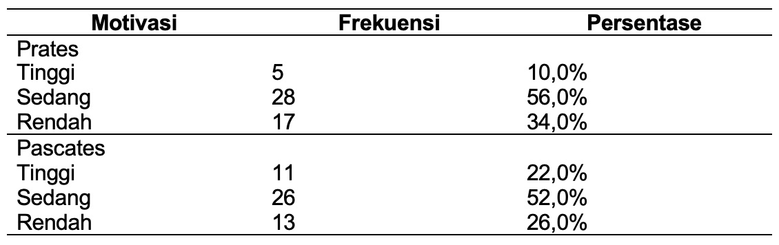 Tabel 2 menunjukkan tingkat motivasi lansia sebelum dan setelah pemberian media kartu motivasi. Dari Prates ke Pascates, bahwa tingkat motivasi tinggi mengalami peningkatan dari 10,0% menjadi 22,0%, sementara tingkat motivasi sedang mengalami penurunan dari 56,0% menjadi 52,0%. Tingkat motivasi rendah juga mengalami penurunan dari 34,0% menjadi 26,0%.