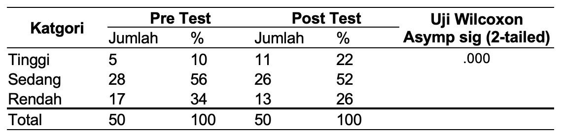 Hasil pre test dan post test menunjukan peningkatan motivasi setelah diberikan media kartu. Uji statistik yang dilakukan dengan menggunakan uji wilcoxon diperoleh angka signifikansi p = 0,000 (p < 0,05). Dapat disimpulkan bahwa ada perbedaan sebelum dan sesudah diberikan media cetak kartu terhadap motivasi (Tabel 3).