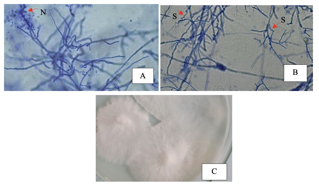 Gambar 4 pengamatan mikroskopis dengan pewarnaan lactophenol cotton blue (perbesaran 40x) dan makroskopis pada media SDA inkubasi suhu 27°C selama 5 hari T. mentagrophytes. (A) N adalah mikrokonidia berbentuk spherical hingga subspherical, (B) S adalah hifa spiral, (C) Koloni T. mentagrophytes berwarna putih, tekstur seperti kapas, tepi undulate dan permukaan datar.