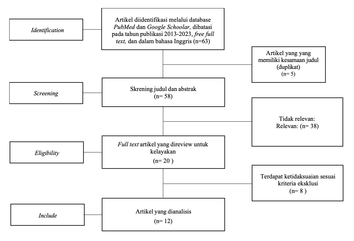 Dalam penelitian ini, jenis literatur yang digunakan adalah artikel penelitian, yang mencakup penelitian cross-sectional. Kriteria inklusi dalam penelitian ini melibatkan artikel-artikel yang diterbitkan antara tahun 2013 hingga 2023, ditulis dalam bahasa Inggris, tersedia dengan akses bebas penuh (open access), serta relevan dengan topik yang diteliti. Sedangkan, kriteria eksklusi mencakup publikasi yang hanya menyediakan abstrak tanpa memberikan akses ke artikel penuh, artikel yang diterbitkan sebelum tahun 2013, penelitian systematic review dan study review, artikel yang tidak relevan dengan topik yang diteliti.