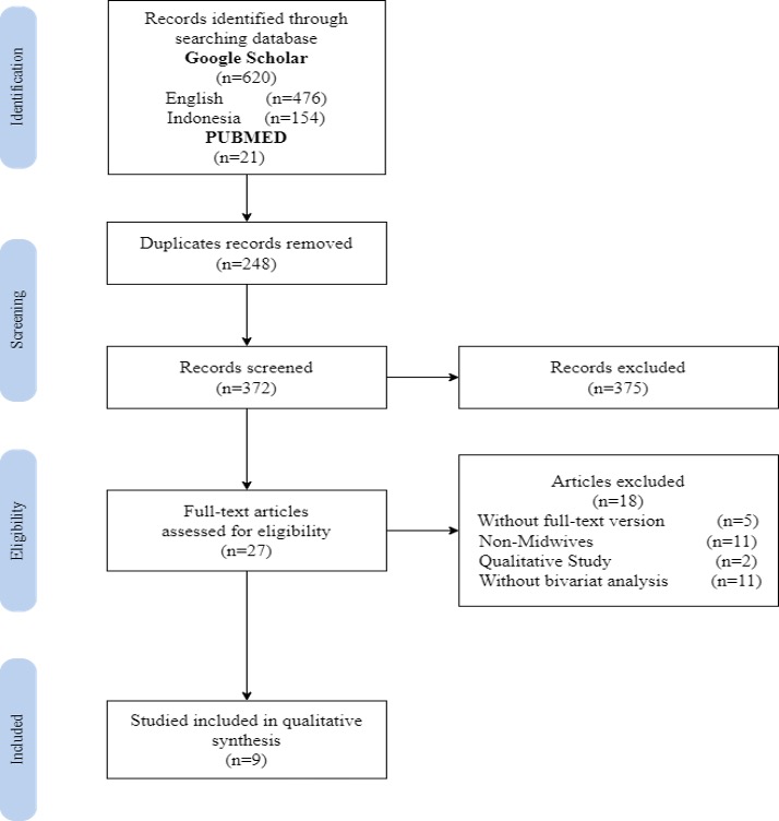 Hasil Penyaringan Studi penelitian mengidentifikasi sebanyak 620 studi melalui pencarian database elektronik (Google Scholar dan PUBMED) sesuai diagram PRISMA. Setelah itu, 248 studi duplikat disaring dan 375 studi lainnya tereklusi saat seleksi judul dan abstrak. Selanjutnya, 18 studi terkeklusi setelah membaca teks lengkap. Akhirnya, 9 studi cross-sectional digunakan dalam telaah sistematis ini (Gambar 1).