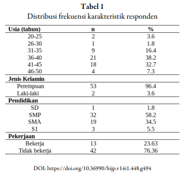 Responden dari kelompok usia 30 an dan 40 an tahun merupakan kelompok usia terbanyak. Rentan usia 36-40 tahun 38.2%, dan usia 41-45 tahun 32.7%. Sedangkan responden dari rentang usia 26-30 tahun hanya sebesar 1.8%. Mayoritas responden berjenis kelaimin perempuan (94.4%). Responden terbanyak memiliki tingkat pendidikan SMP yaitu sebesar 58.2% sedangkan pendidikan SD hanya sebesar 1.8%. Sebagian besar responden tidak bekerja, yaitu sebesar 76.3% sedangkan yang bekerja sebanyak 76.36%.