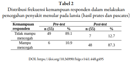 Hasil prates menunjukkan bahwa sebagian besar responden tidak mampu mencegah penularan penyakit menular pada lansia yaitu sebesar 89.1% sedangkan yang mampu melakukan pencegahan hanya sebesar 10.9%. Sebaliknya nilai pascates menunjukkan sebagian besar responden mampu melakukan pencegahan penyakit menular pada lansia yaitu sebesar 87.3% sedangkan yang tidak mampu mencegah sebesar 12.7%.