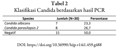 Tabel 2. Klasifikasi Candida berdasarkan hasil PCR DOI: https://doi.org/10.36990/hijp.v14i1.459.g488