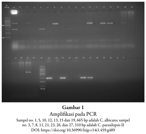 Primer yang digunakan yaitu C. albicans (665 bp), C. parasilopsis 1 (887 bp), C. parasilopsis 2 (230 bp), C. guilliermondii (205 bp), C. lusitaniae ( 799 bp ). Campuran reaksi amplifikasi PCR diambil sebanyak 25 ?l dengan enzim Kappa sebanyak 12,5 ?l, MgCl. 0,5 ?l, 10 ?M primer forward 1 ?l, 10 ?M primer reverse 1 ?l dan produk DNA 10 ?l. Kemudian dilakukan amplifikasi pada alat PCR dengan suhu sebagai berikut: