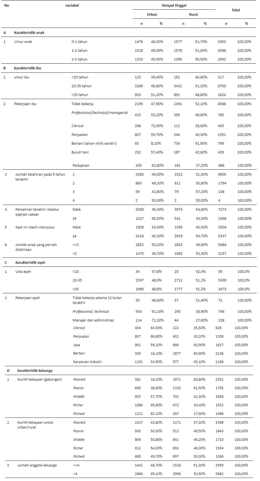 Tabel 1 menunjukkan bahwa karakteristik usia anak yang tinggal di wilayah rural dan urban dalam penelitian ini tidak berbeda secara deskriptif yaitu berusia antara 0-3 tahun. Terdapat perbedaan karakteristik ibu yang tinggal di wilayah rural dan urban yaitu ibu yang berusia <20 tahun lebih dari separuhnya (60,60%) tinggal di wilayah rural. Pekerjaan pada sektor pertanian (91,9%) didominasi oleh ibu yang tinggal di wilayah rural sedangkan pekerjaan sebagai clerical (72%) mendominasi di wilayah urban. Sebesar 65% persalinan melalui operasi caesar terjadi di wilayah urban, sedangkan di wilayah rural lebih banyak ibu yang melahirkan melalui persalinan normal. Durasi menyusui lebih panjang pada ibu di wilayah rural dibandingkan urban.