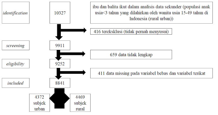 Populasi sumber dari penelitian ini adalah seluruh anak usia <3 tahun yang dilahirkan oleh wanita usia 15 – 49 tahun di Indonesia dan bertempat tinggal di wilayah rural/urban saat survei berlangsung. Sampel diambil dengan teknik total sampling melalui pembatasan kriteria. Kriteria inklusi yang digunakan untuk membatasi subjek adalah usia anak <3 tahun (diperoleh 10327 subjek), pernah/masih menyusui (diperoleh 9911), dan data lengkap (diperoleh 9252). Setelah dilakukan cleaning dan menghilangkan data missing di tiap variabel yang diteliti, diperoleh sebanyak 8841 subjek. Selanjutnya, subjek dikelompokkan berdasarkan tempat tinggal urban dan rural dengan jumlah subjek urban sebanyak 4372 subjek urban dan subjek rural sebanyak 4469 subjek.