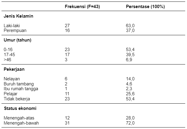 Mayoritas responden berjenis kelamin laki-laki yaitu 27 responden (73.0%), umur dengan kategori anak-anak 53,4% dan kemudian dewasa 39,5%. Mayoritas responden bekerja sebagai pelajar 25,6% dan tidak bekerja 53,4%. Status ekonomi responden adalah menengah ke bawah (72,0%) dan sisanya menengah ke atas (28,0%) (Tabel 1).