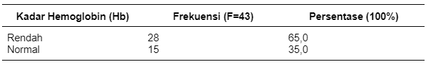 Menunjukkan bahwa responden yang melakukan pemeriksaan tes diagnostik cepat kadar hemoglobin (Hb) dengan hasil rendah pada sebanyak 28 responden (65,0%) dan jumlah responden dengan kadar hemoglobin (Hb) normal adalah 15 responden (35,0%) (Tabel 2).