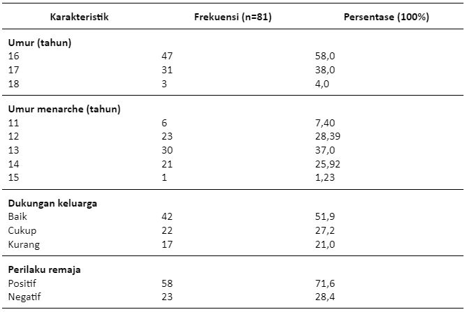 Karakteristik umur mayoritas responden adalah 16 tahun (58,0%) dan kemudian 17 tahun (38,0%). Mengalami menarche pada umur 13 (37,0%), 12 (28,39%), dan 14 (25,92%). Dukungan keluarga dalam kategori baik (51,9%), dan perilaku remaja dalam kategori positif (71,6%) (Tabel 1).