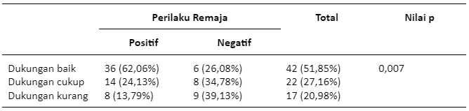 Hasil uji statistik dalam tabulasi silang antara dukungan keluarga dalam kategori baik, dengan perilaku remaja positif memperlihatkan hasil terbanyak. Uji hubungan antara dukungan keluarga dengan perilaku remaja, nilai p kurang dari 0,05 (Tabel 3).