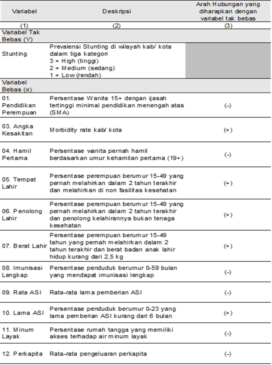 Jumlah sampel yang digunakan dalam penelitian ini adalah 514 sampel. Jumlah sampel tersebut mewakili jumlah kabupaten/kota yang ada di Indonesia pada tahun 2021. Dari hasil tinjauan pustaka didapatkan beberapa variabel yang diperkirakan memiliki hubungan yang kuat dalam menurunkan kejadian stunting di Indonesia. Variabel tersebut antara lain pendidikan perempuan yang didekati dengan ijazah tertinggi yang dimiliki oleh perempuan, umur saat melahirkan, riwayat penyakit yang diukur melalui variabel angka kesakitan di wilayah tersebut, pelayanan kesehatan dengan pendekatan melalui fasilitas kesehatan dan penolong kelahiran, berat bayi ketika lahir, imunisasi lengkap, ASI eksklusif dengan pendekatan rata-rata dan lama pemberian ASI dan sanitasi yang diukur melalui akses air minum layak serta pendapatan rumah tangga yang di dekati dengan rata-rata pengeluaran perkapita.