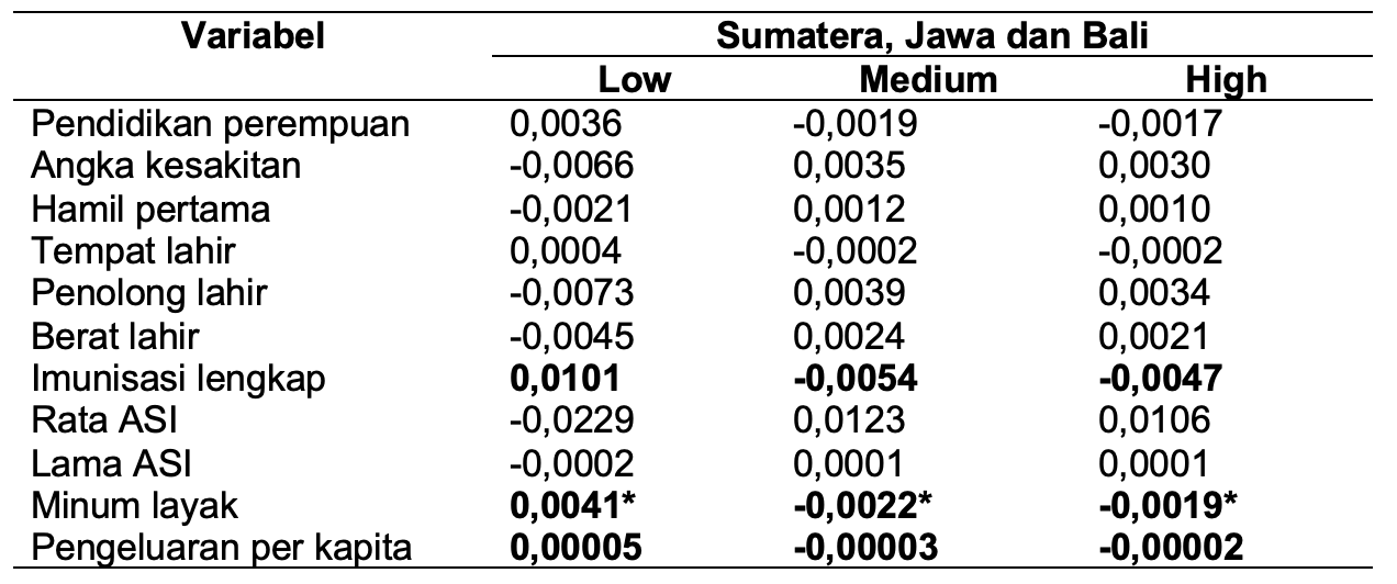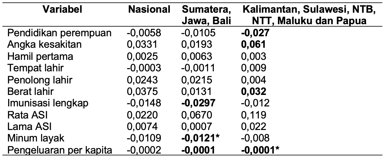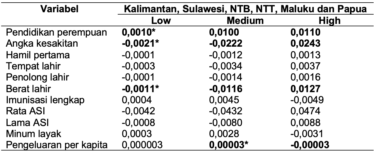Pendidikan perempuan dan angka kesakitan serta berat lahir menjadi variabel yang signifikan di wilayah Kalimantan, Sulawesi, NTB, NTT, Maluku dan Papua, tetapi menjadi tidak signifikan di wilayah Sumatera, Jawa dan Bali. Hal yang sama juga terjadi dengan variabel imunisasi lengkap dan akses air minum layak. Kedua variabel ini menjadi signifikan di wilayah Sumatera, Jawa, Bali tetapi tidak signifikan di wilayah Kalimantan, Sulawesi, NTB, NTT, Maluku dan Papua.