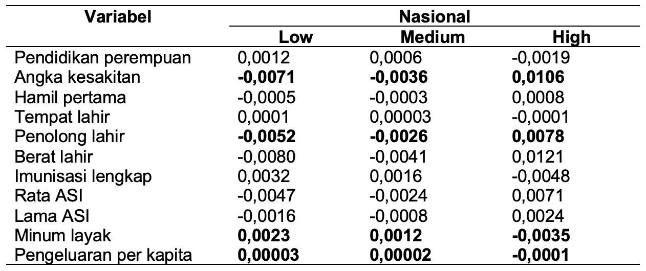 Dari keseluruhan variabel yang signifikan di level nasional, variabel berat lahir memiliki efek yang terbesar mempengaruhi kejadian stunting di Indonesia. Berbanding terbalik dengan berat lahir, pengeluaran per kapita memiliki pengaruh yang paling lemah jika dibandingkan dengan variabel lain yang signifikan mempengaruhi kejadian stunting.
